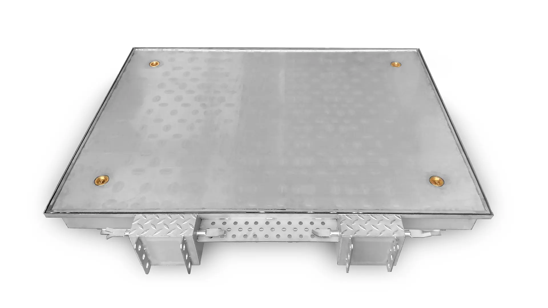 Chaque trappe est composée d'un cadre de montage de 240 mm de hauteur et d'un couvercle en tôle striée en acier inoxydable, articulé le long du côté le plus long. La trappe est résistante aux gaz et aux projections d'eau, ce qui la rend parfaite pour des conditions de forte humidité et des exigences d'étanchéité élevées.